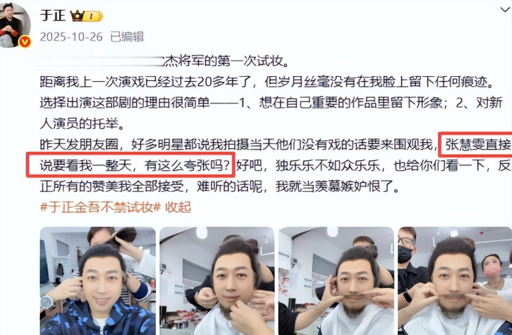 此次上演是于正久别演艺圈20年之后的追忆之作,他一分钱都莫得要,在剧中饰演沈洁将军这个变装。