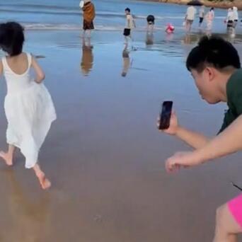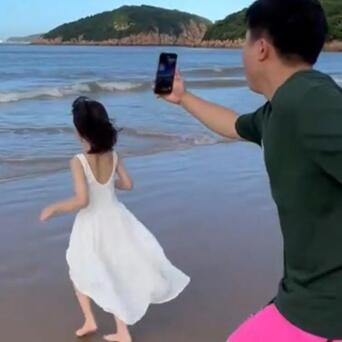 负责看,沙滩上,宝爸跟在奔走的犬子死后拍视频,身段左扭右扭,姿势搞笑,本认为成片笃定一般,效果成片好意思到我了,超等有氛围感。