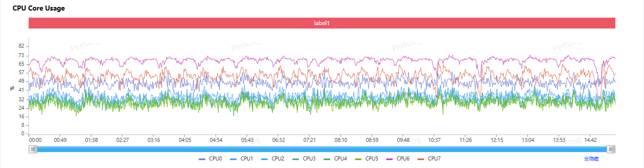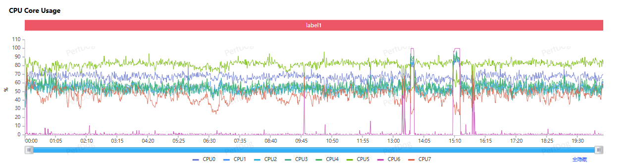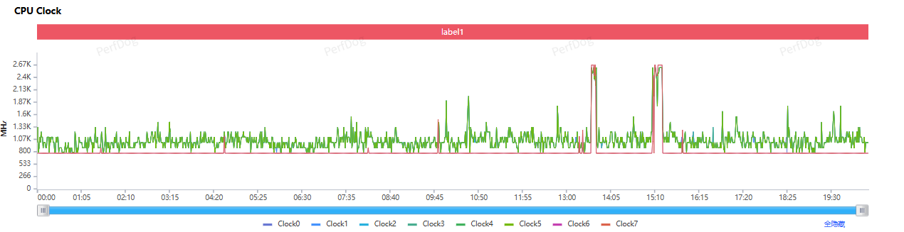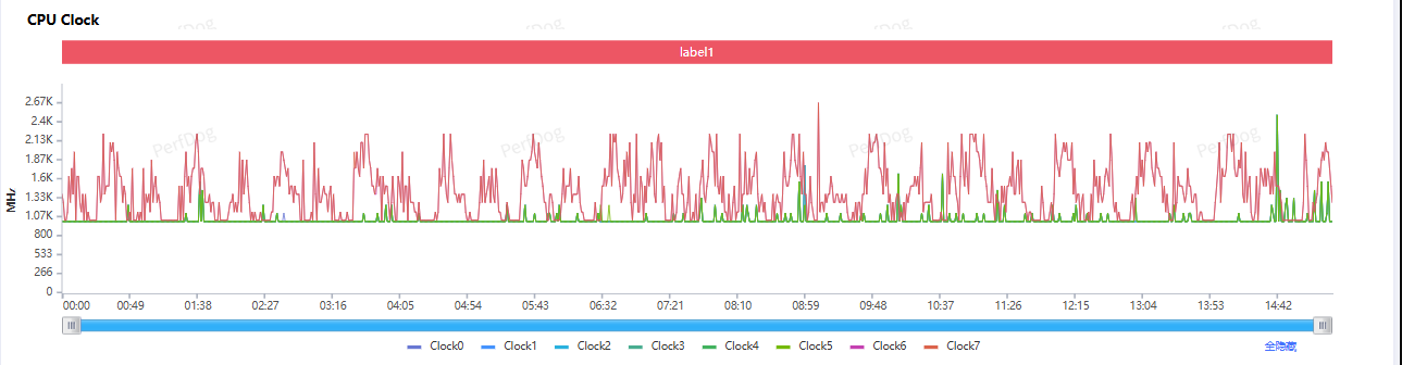 再看 CPU 的中枢调节,举座上是比较积极的,八个中枢沿途有比较积极的占用,其中 6 个性能中枢举座上一直保持 1.0GHz 以上的输出水平,两枚超等中枢则在 1.0GHz 和 2.4GH 之间庸碌波动。