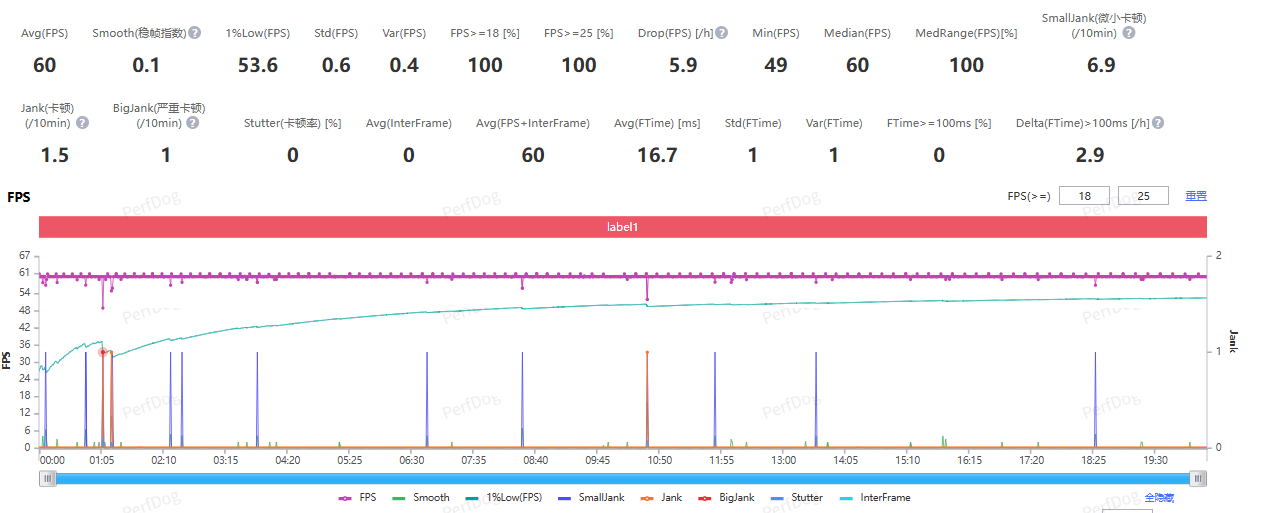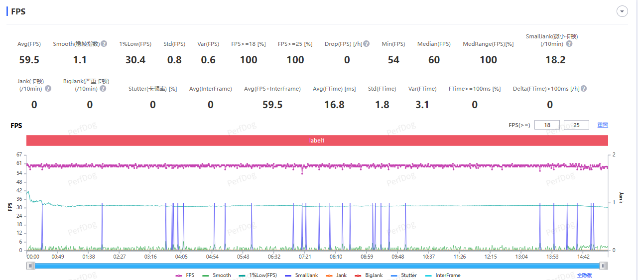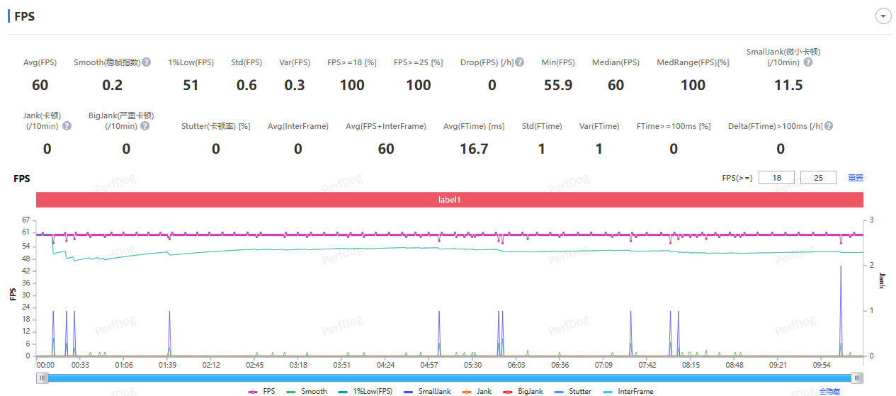 跑图 10 分钟后,测得游戏运行平均帧率为 60 FPS,整个过程也莫得遭逢卡顿掉帧的情况,帧率弧线上险些没什么波动。
