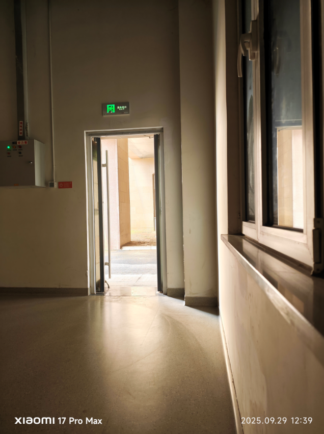 底下这个场景后光对比愈加激烈,可以看到小米 17 Pro Max 凭借高动态限制的上风,走廊内和门外的细节齐得到保留,何况暗部也很皑皑,细节丰富,亮部莫得过曝,LOFIC 时期带来的画面优容度照实不俗。