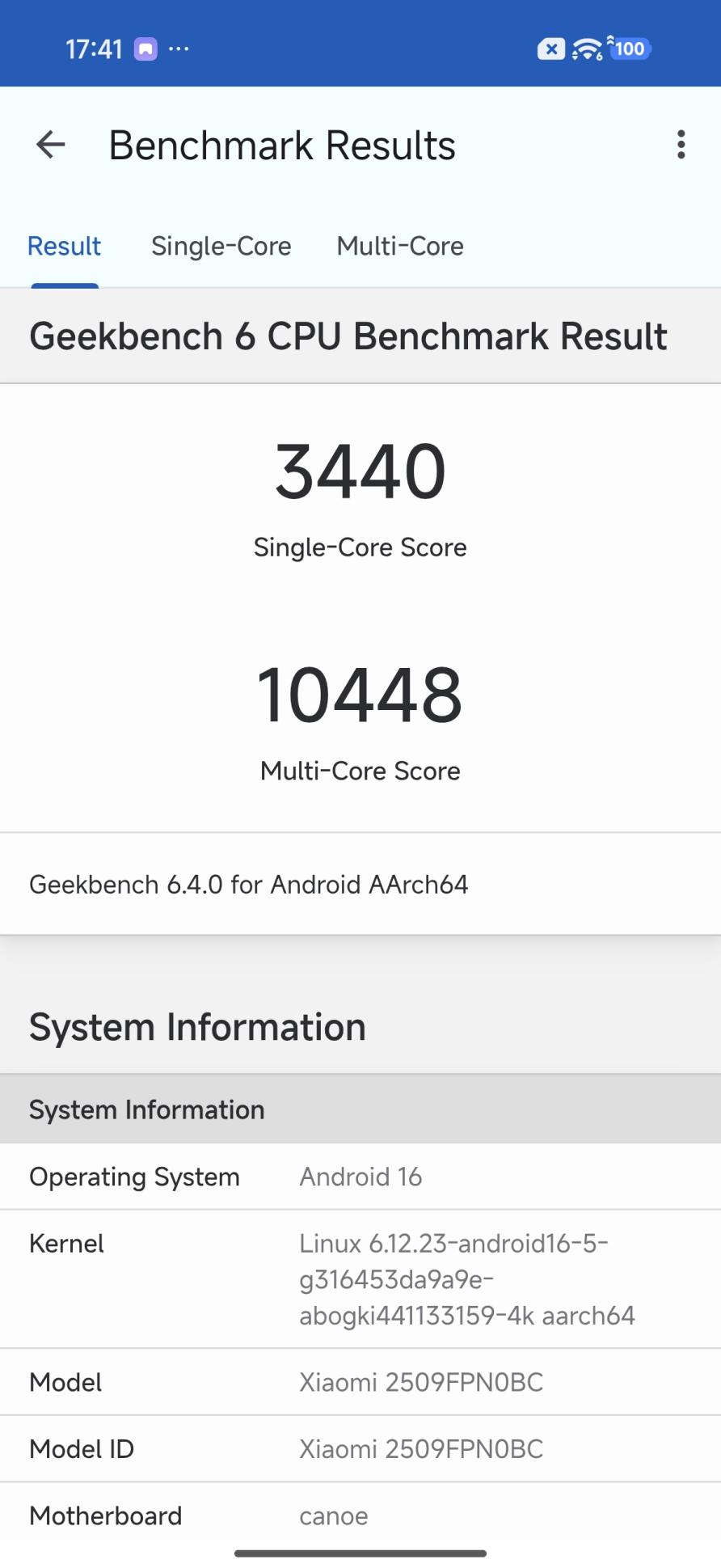 再看 GeekBench 6 的 CPU 跑分,单核 3440 分,多核成绩达到 10448 分,通常是十分出色。