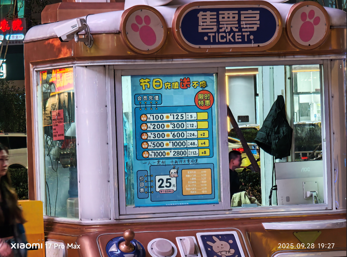 切换到 5 倍镜头后,画面依然澄澈亮堂,色调明艳,而且夜晚时候,长焦的说明力也莫得着落,售票亭上的价目表即即是小字也澄澈可见。