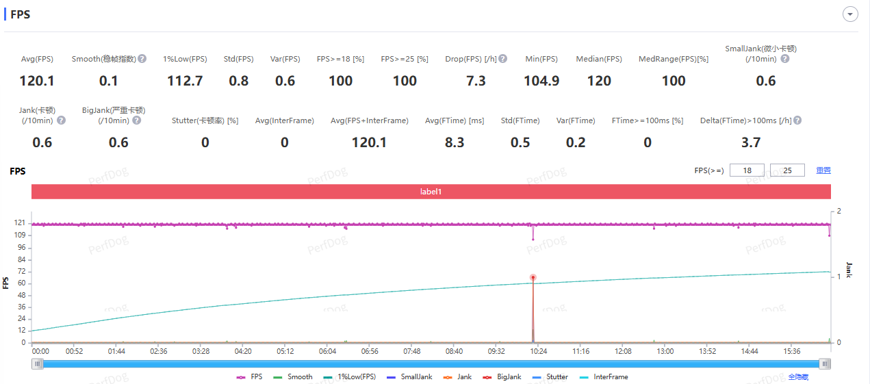 领先是《王者荣耀》,测试时画质选项齐拉到最高,然后进行 15 分钟驾驭的一局东谈主机对战,关于小米 17 Pro Max 来说是简陋支吾莫得压力,游玩过程中莫得卡顿掉帧的嗅觉,十分泄漏,测得平均帧率 120.1 FPS,帧率弧线险些就是一条直线。