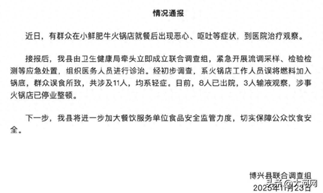 11月22日,有网友发视频称,山东博兴县小鲜肥牛暖锅,服务员把燃料加到锅底,导致10东说念主入院,面前还有3个东说念主在病院。