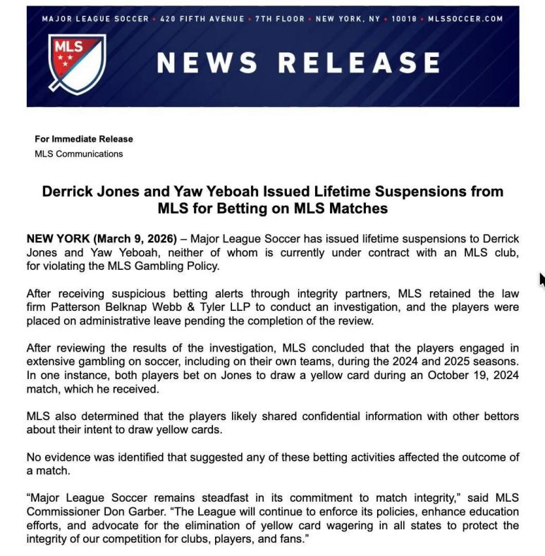 3月10日,好意思国奇迹足球大定约(以下简称:“好意思职联”)秘书欧洲杯体育,曾遵循于好意思职联的两名球员德里克·琼斯和叶博亚因涉赌被好意思职联毕生禁赛。