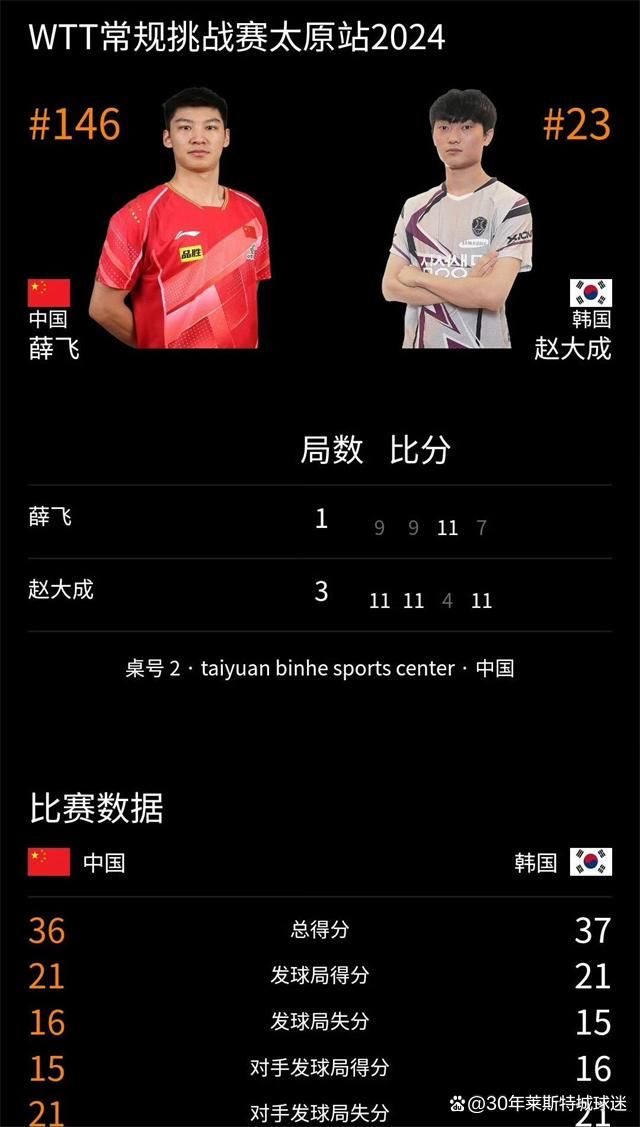 WTT惯例挑战赛太原站,男单1/16决赛,国乒直板大将薛飞1-3韩国选手赵大成,无缘16强,四局比分为9-11欧洲杯app,9-11,11-4,7-11。