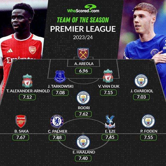 WhoScored评比23/24赛季英超最好阵,曼城4东说念主、利物浦2东说念主、阿森纳&切尔西各1东说念主,哈兰德、福登、帕尔默、萨卡入选。
